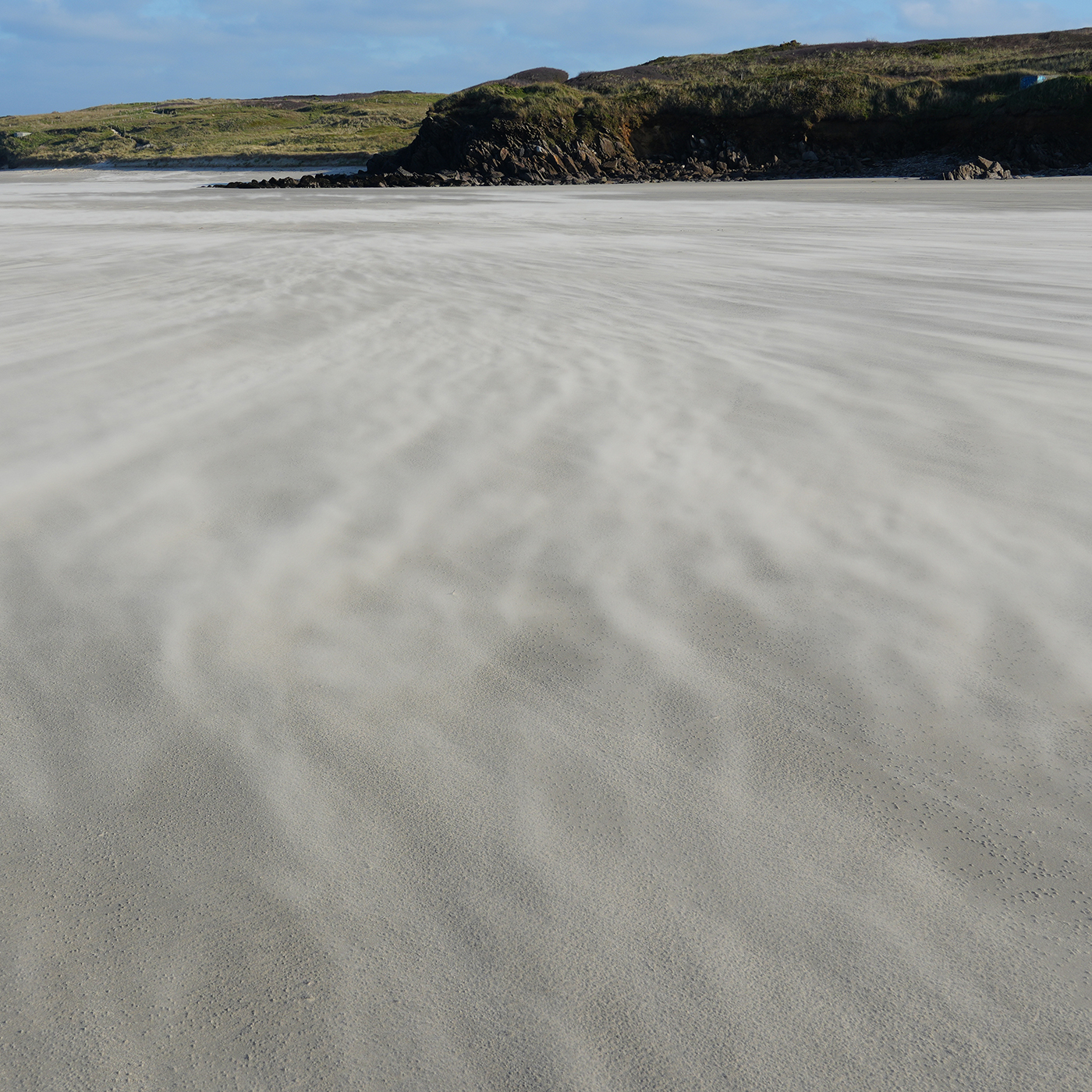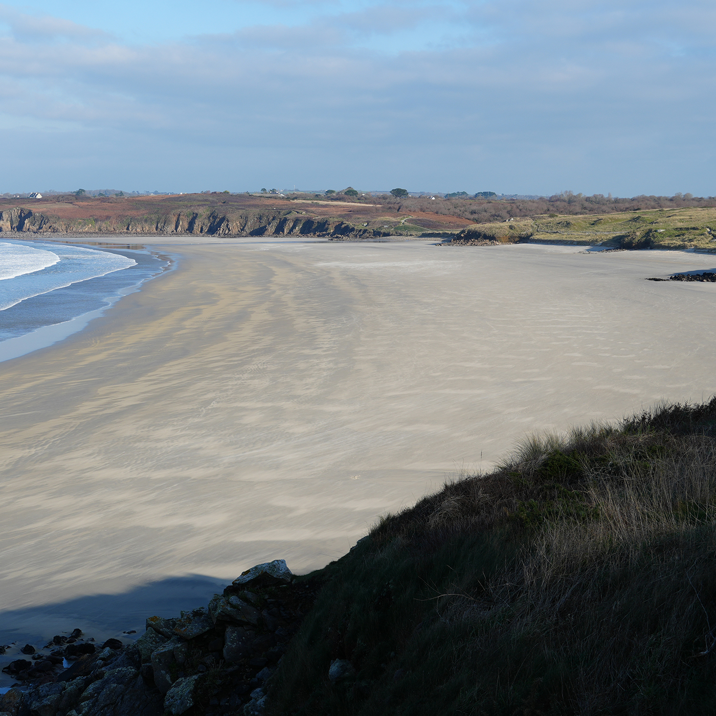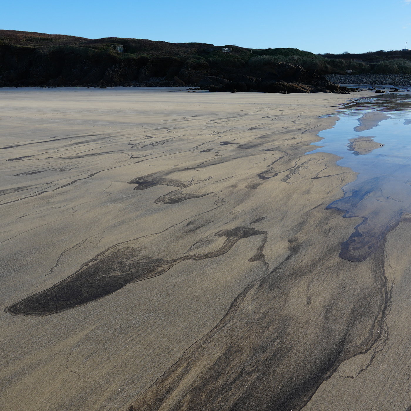 Der Strand „Les Blancs Sablons“, „Gwendraezh“ auf Bretonisch, liegt nahe der Kleinstadt Le Conquet in Finistère in der Bretagne und ist bei Surfern jeder Art überaus beliebt wegen der kräftigen Winde und dem damit einhergehenden Wellengang. Die gesamte Gegend liegt auf einer keilförmigen Gesteinsformation aus Granit, die nicht nur weit landeinwärts, sondern auch bis zu 7000 Meter in die Tiefe reicht: Ehemalige Berge, fast so hoch wie der Himalaya, die nicht abgetragen wurden, sondern nach und nach in der Tiefe der weichen Erdschichten verschwanden.