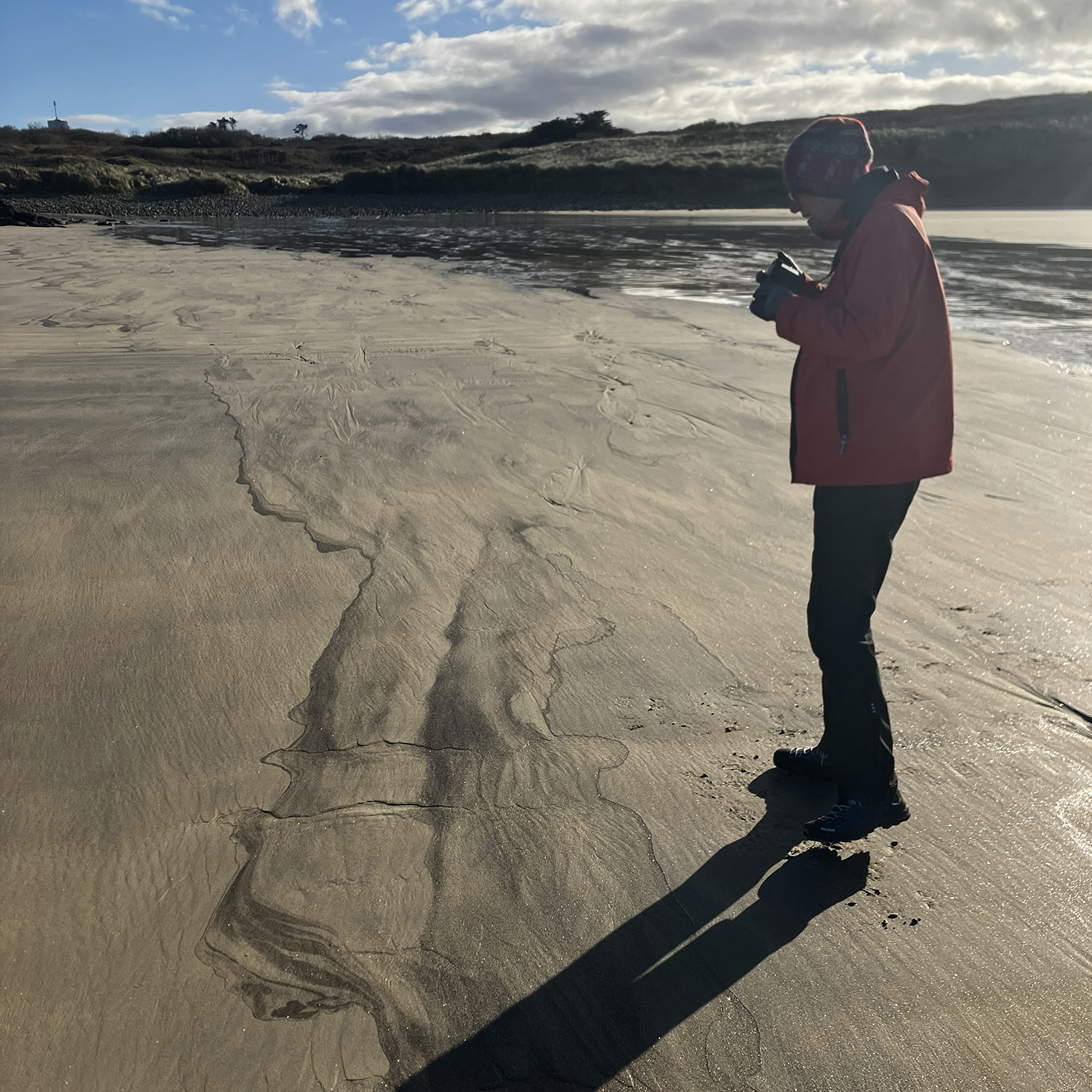 Dieser Granit hat im Wesentlichen drei Bestandteile: Feldspat, weiße Körner, die den überwiegenden Anteil des Sandes dort ausmachen, hellgrauer Quarz sowie schwarzer Glimmer aus der Gruppe der Schichtsilikate, auch Mica genannt. Das Besondere am Glimmer ist, dass er in Schichten aufgebaut ist, die eine sehr schwache Bindung untereinander aufweisen und sich darum an den Schichtgrenzen leicht lösen. Dieser schwarze Glimmer im Sand hat die Form von Pailletten, die in den Wellen surfen wie Blätter im Wind. Aus diesem Grund bewegt sich der schwarze Glimmer in den zurücklaufenden Wellen schneller als die hellen Feldspate und Quarze, die dem Wasser mehr Widerstand bieten und schneller zu Boden sinken.